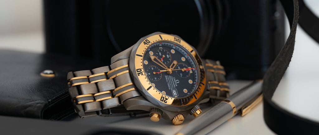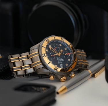 In this episode, we will be talking about the 2296.80.00 Omega Seamaster Diver 300m Chronograph from 1996. This beautiful piece has been mine since late 2023. It is primarily made out of grade 1 titanium, with centre links and bezel made out of tantalum. The Bezel inlay, crown, helium release valve, chronograph pushers, and outer centre links are crafted out of 18k rose gold. The watch features a helium valve (mentioned earlier) and a screw down crown. The movement inside the watch is Valjoux 7750-based. This is the Omega calibre 1164, which was also used in other Omega Seamaster models, such as the 2297.80.00 and 2298.80.00, which are part of the Holy Trinity of Seamasters. This watch measures 42.5mm in case size and 16.5mm in thickness.