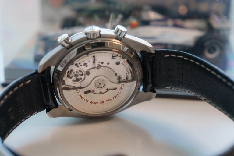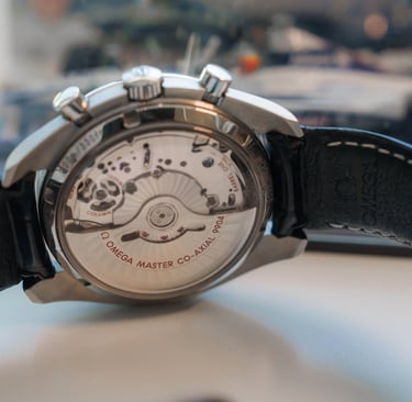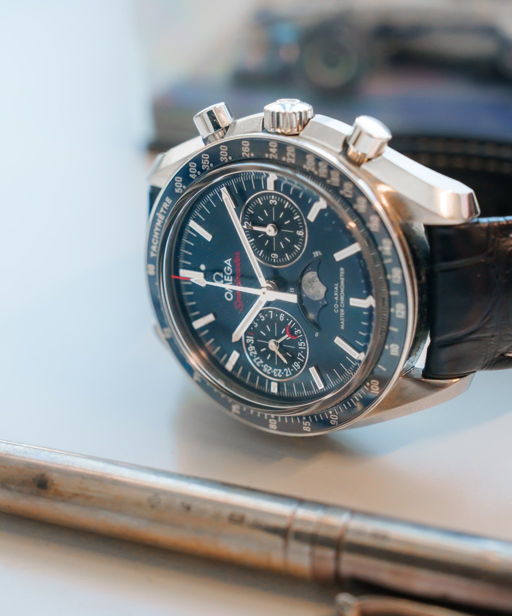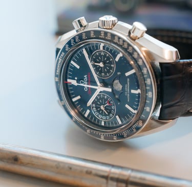 In this episode, we will be talking about the 304.33.44.52.03.001 Omega Speedmaster. I'm going to start and tell you straight away that this timepiece is a giant, and has a case size of 44.25mm, a thickness of 16.9mm, and a lug width of 21mm. The Case is made out of steel, and the bezel is ceramic. From complications, Omega supplied us with a moonphase, chronograph, small seconds, and date. The calibre in this watch is the Omega 9904 with 60 hours of power reserve. This caliber utilizes a silicone escapement mechanism, which makes it immune to magnetism. The watch is also rated to 100m of water resistance, with no screw down crown. The total weight of the watch with the original alligator leather strap is 120g.